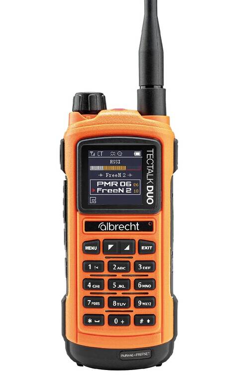 • Az új és nagy teljesítményű Albrecht Tectalk Duo két frekvenciasávval rendelkezik: a klasszikus PMR446 frekvenciákkal és a Freenet (1 wattos átviteli teljesítmény) nagyobb hatótávolságért. Használata regisztráció és díjak nélkül ingyenes. Az Albrecht Tectalk Duo professzionális felhasználóknak rendkívül robusztus, jelzőszínű házat és nagyon kiterjedt funkciókat kínál. A por- és fröccsenésálló ház ideális kültéri használatra.