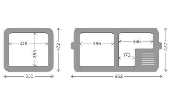 • Dimensions: 530 mm (depth) x 472 mm (height) x 962 mm (width)