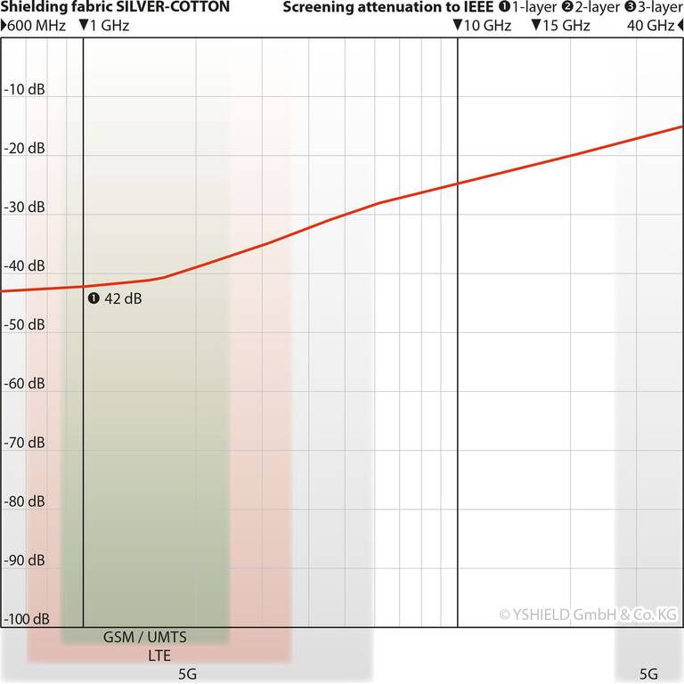 This product shields high frequency electromagnetic fields (HF). Unless otherwise stated, the indicated dB-values apply to 1 GHz. Measurement from 600 MHz to 40 GHz according to standards ASTM D4935-10 or IEEE Std 299-2006