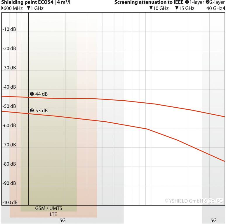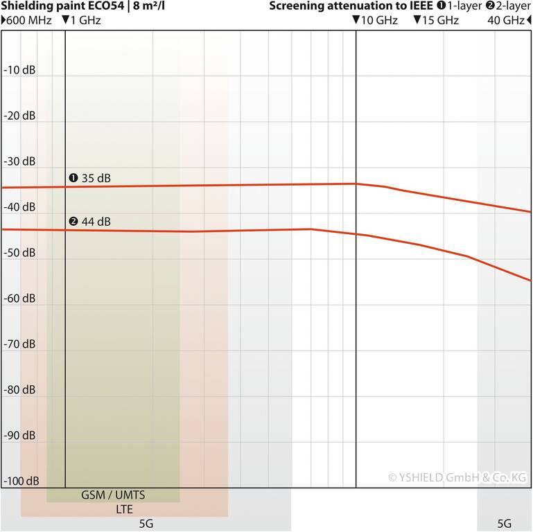 Ez az árnyékoló festék magas frekvenciájú elektromágneses mezőket (HF) árnyékol, és az IEEE Std 299-2006 szabványnak megfelelően 600 MHz-től 40 GHz-ig tesztelték. Mivel a 40 GHz-es magas frekvenciákat még nem használják széles körben, az általunk megadott árnyékolási csillapítási értékek mindig 1 GHz-re vonatkoznak. Ez az elektromosan vezető felületű árnyékoló festék az alacsony frekvenciájú váltakozó elektromos mezőket (LF) is árnyékolja.