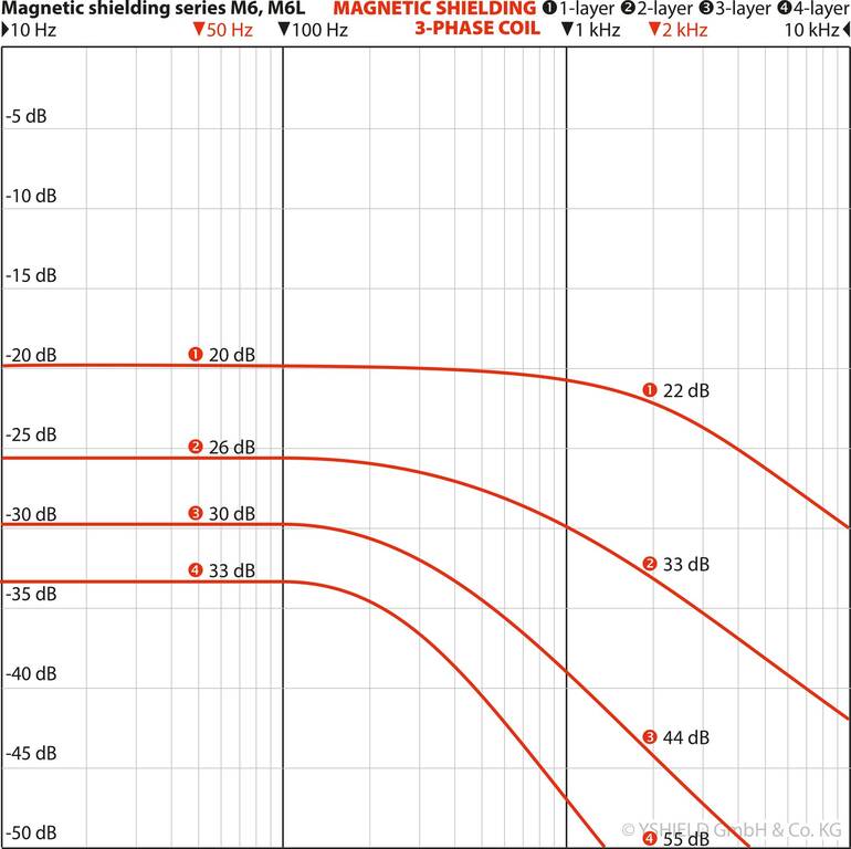 • Attenuation magnetic fields (Static): DC consumers, earth magnetic field, permanent magnets are shielded in a range from 15 % (single-layer) to 58 % (four-layer)