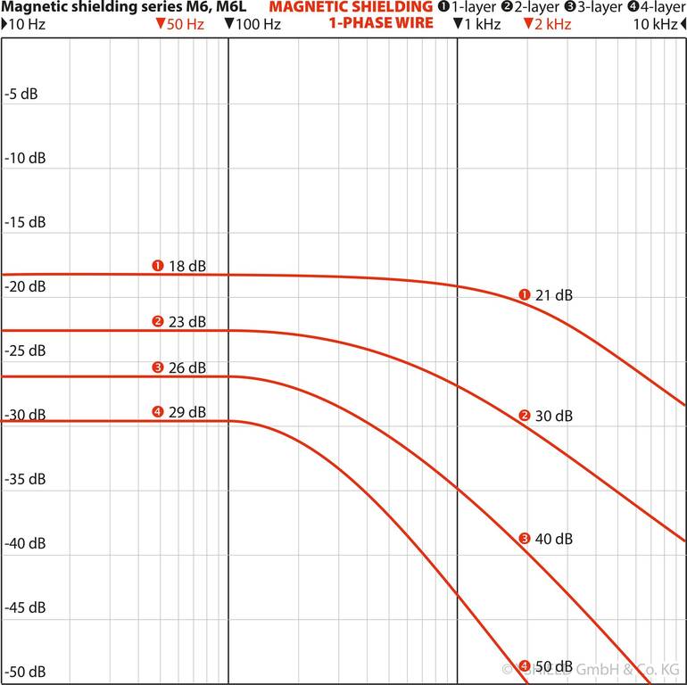 • Attenuation magnetic fields (Three-phase 50 Hz): Single-layer 19.5 dB (89.4 %), two-layer 25.7 dB (94.8 %), three-layer 30.2 dB (96.9 %), four-layer 32.6 dB (97.7 %)