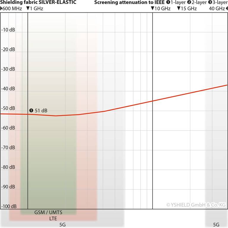 This product shields high frequency electromagnetic fields (HF). Unless otherwise stated, the indicated dB-values apply to 1 GHz. Measurement from 600 MHz to 40 GHz according to standards ASTM D4935-10 or IEEE Std 299-2006.